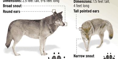 As adults, wolves average 30 inches in height at the shoulder and 65 pounds. Their feet are generally 3 1/2 inches wide and 4 1/2 inches long and provide an easy way of differentiating wolves from coyotes, whose feet are only 1 1/2 inches wide and 2 1/2 inches long.